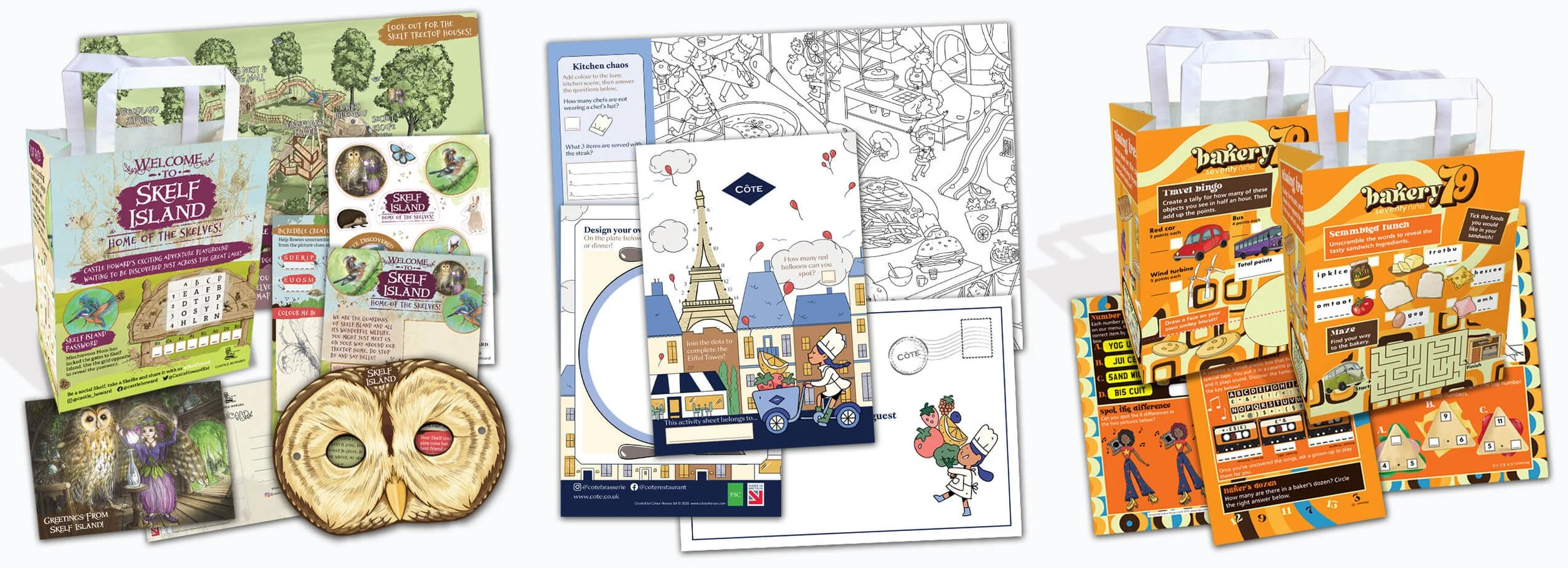 Our fully bespoke packs can contain a wide range of elements to suit your brand and budget including activity books to suit a variety of age ranges. Colouring-in sheets, branded crayons, standees, stickers, craft cards, finger puppets, postcards, seeds and branded merchandise.