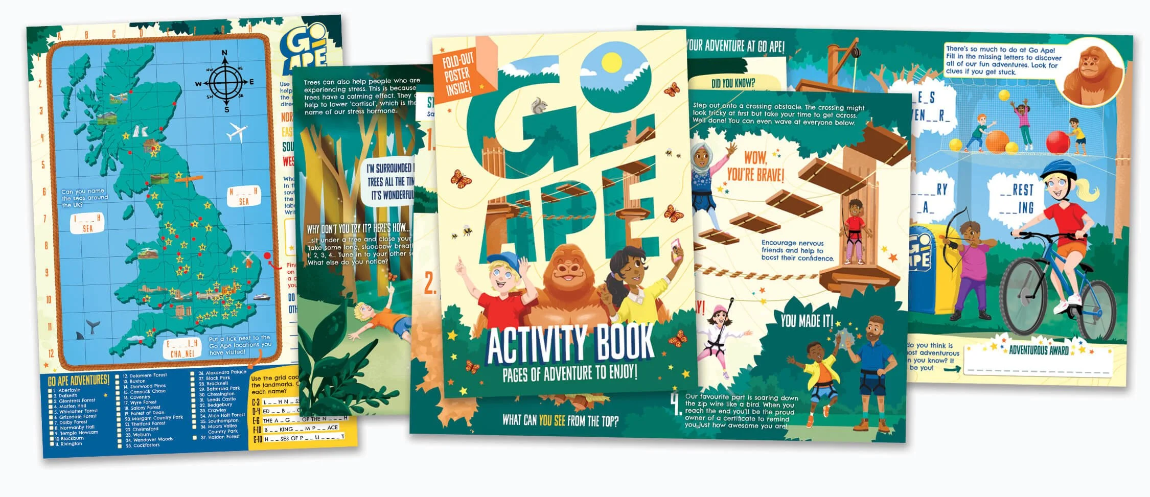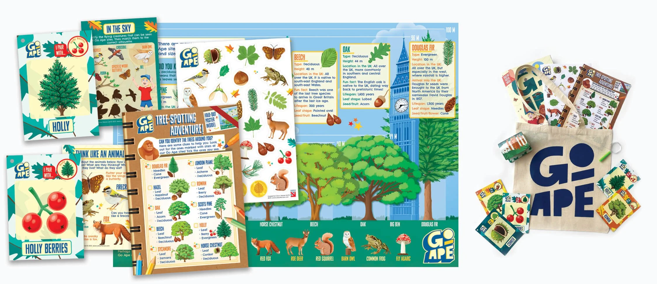 A bespoke children’s activity pack created for the Go Ape. Each pack contains an A4 activity book, a tree-spotting adventure fold-out A2 poster, A5 sticker sheet, a set of matching pairs tree-spotting cards, binoculars, magnifying glass and a bespoke tote bag.